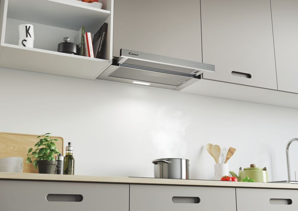 Ο απορροφητήρας της εταιρείας Candy τοποθετείται σε ντουλάπι και σύρεται μόνο το μέρος του απορροφητήρα που περιέχει τα φίλτρα.