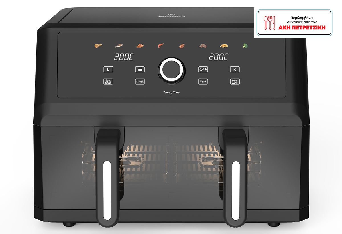 Φριτέζα αέρος XXXL της Morris. Με μεγάλη χωρητικότητα 10,4 λίτρα και δυνατότητα χρήσης είτε ως ενός ενιαίου χώρου (single zone) είτε ως 2 ανεξάρτητων (dual zone) για ξεχωριστό μαγείρεμα. Με τη λειτουργία Sync υπάρχει η δυνατότητα ρύθμισης ολοκλήρωσης ψησίματος διαφορετικών φαγητών με διαφορετικές θερμοκρασίες ή/και ρυθμίσεις την ίδια ώρα. Διαθέτει αφαιρούμενο κάδο ΧXXL και βάση ψησίματος με αντικολλητική επίστρωση για ευκολία στο καθάρισμα!