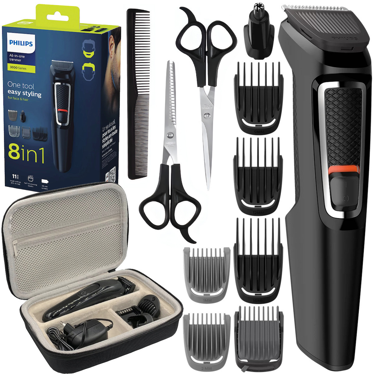 Ρυθμιζόμενη χτένα για γένια 3-7 χιλ., εξάρτημα ψαλιδίσματος για μύτη & αυτιά, εξάρτημα ψαλιδίσματος, 2 χτένες για γένια, 3 χτένες για μαλλιά, θήκη φύλαξης